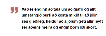 Mikilvægt er að allar fjölskyldur, öll börn, fái að upplifa góðar stundir ekki síst á jólum og eignist góðar minningar sem lifa með þeim alla ævi. Þá er mikilvægt að foreldrar sem búa við bág kjör fái stuðning svo að efnislegur skortur komi ekki í veg fyrir að hægt sé að gera sér glaðan dag um jólin. Það er enginn að tala um að gjafir og allt umstangið þurfi að kosta mjög mikið til að jólin séu gleðileg, heldur að á jólum geti allir leyft sér aðeins meira og engin börn líði skort.