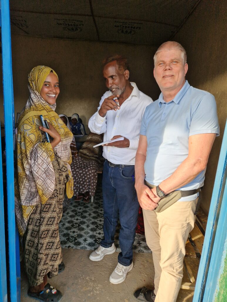 Hodon Smail Hassan er sannfærð um að sparnaðar- og lánahóparnir muni breyta sínu lífi og fjölmargra annarra sveitunga hennar. Hér er hún á spjalli við Bjarna Gíslason, framkvæmdastjóra Hjálparstarfsins, og Ahmed Nur sem er starfsmaður verkefnisins.